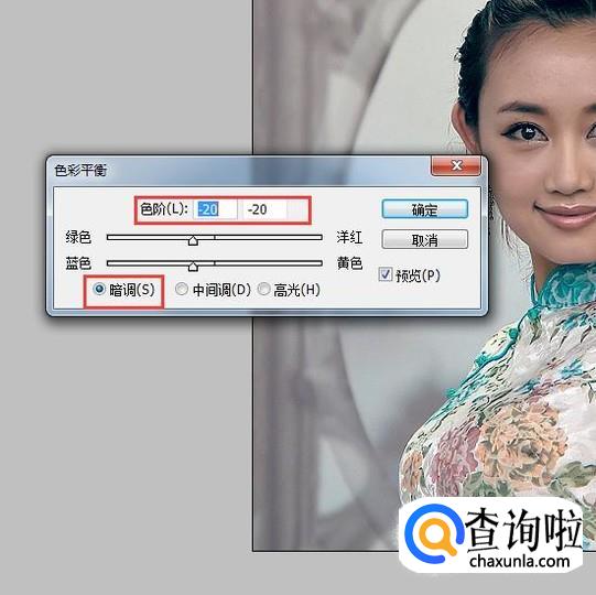 在【色彩平衡】中,将【暗调】里的色阶都改为【-20】。