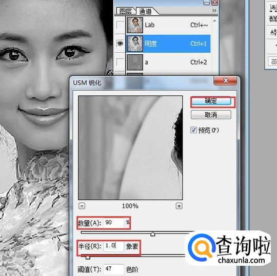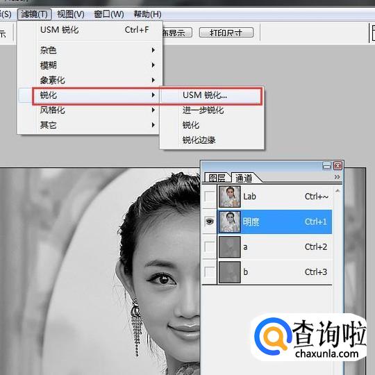 选择同道里的【明度】,然后点【滤镜】里的【锐化】【USM锐化】。