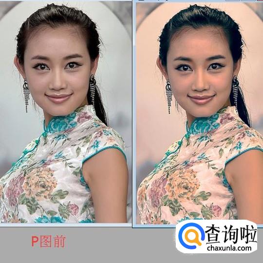 附上一张对比图,我们能明显看出P图后美女的脸上泛着红晕,脸上更加油润自然