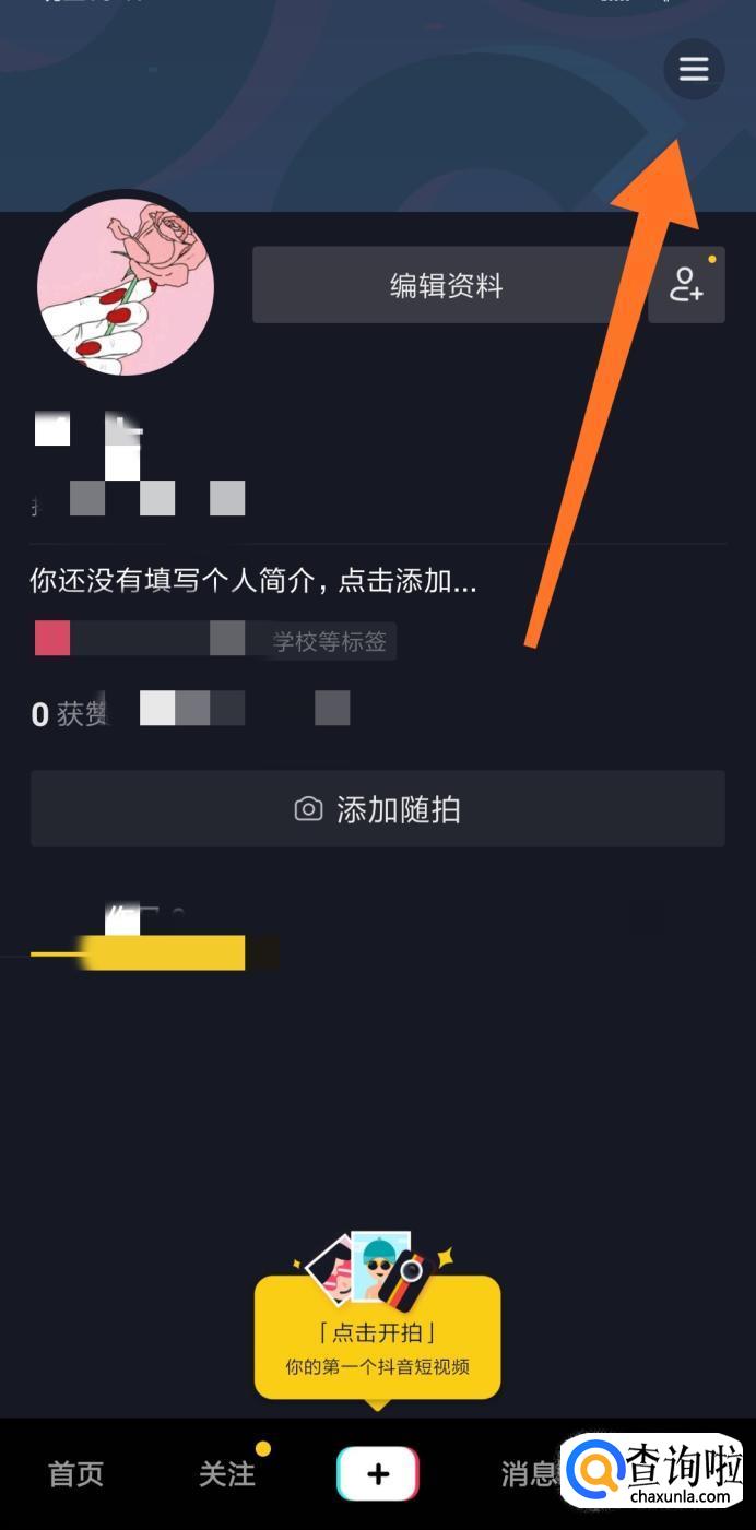 进入到抖音账号界面后,点右上角的选项。如下图: