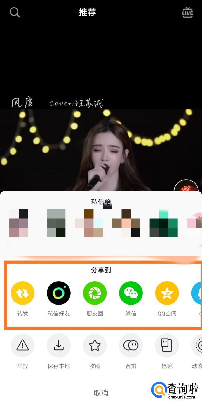 最后,退出抖音,再重新点击进入。点击页面的右边有一个转发的箭头,就会出现下图的界面,大家可以选择自己想要转发的位置,如:朋友圈等等。