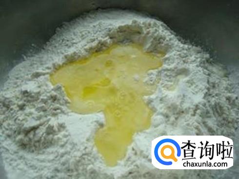 把面粉放盆里、加入营养粉、苹果泥、蛋清,搅匀后揉成光滑的面团,再把面团擀成长条,用刀切成1厘米见方的面条。