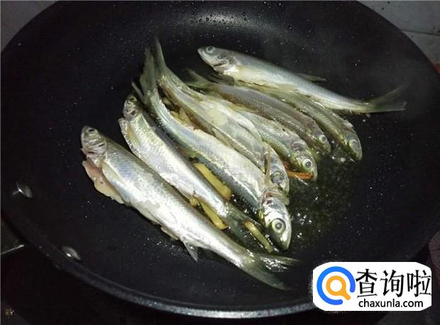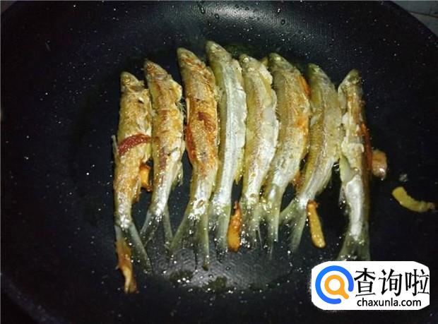 放入小鱼后,先不要急着翻动鱼身,要把鱼的一面煎到金黄色,再翻另一面煎。