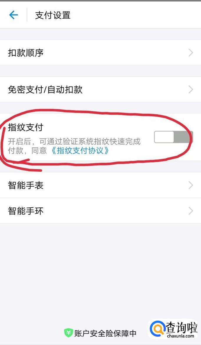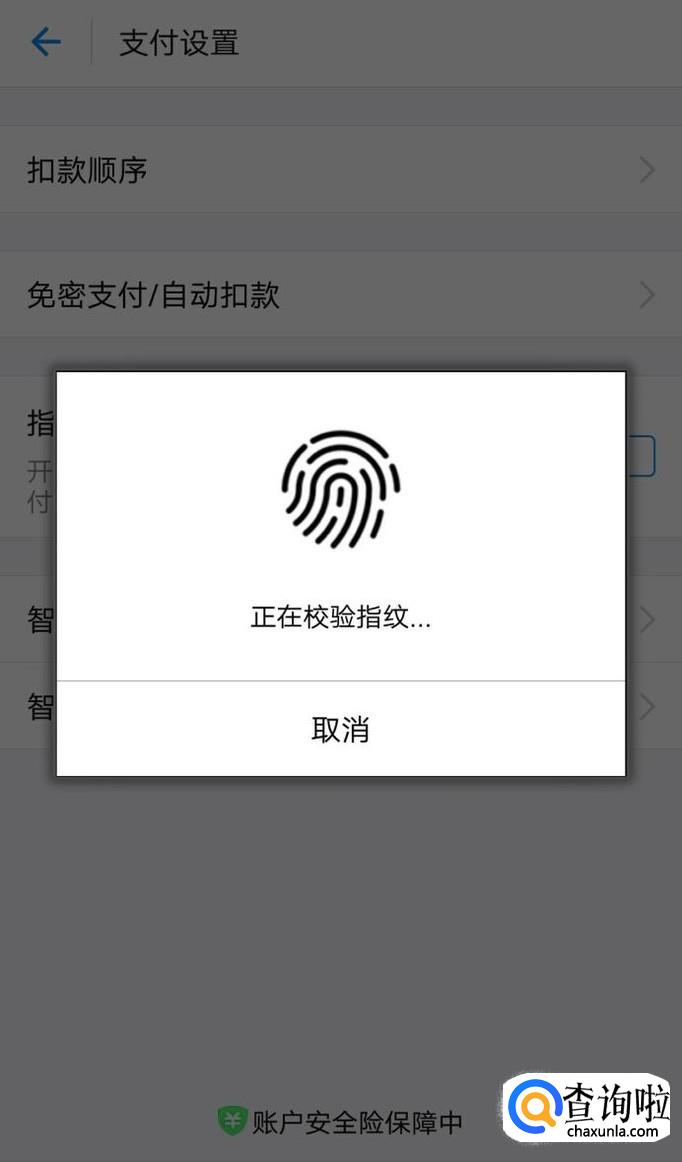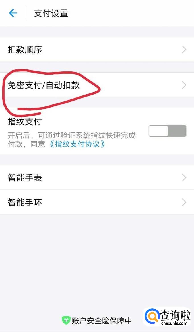 返回,在免密支付的下面有“指纹支付”,选这个选项,录入自己的指纹,可以达到免密支付一样的效果。
