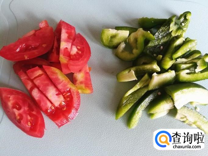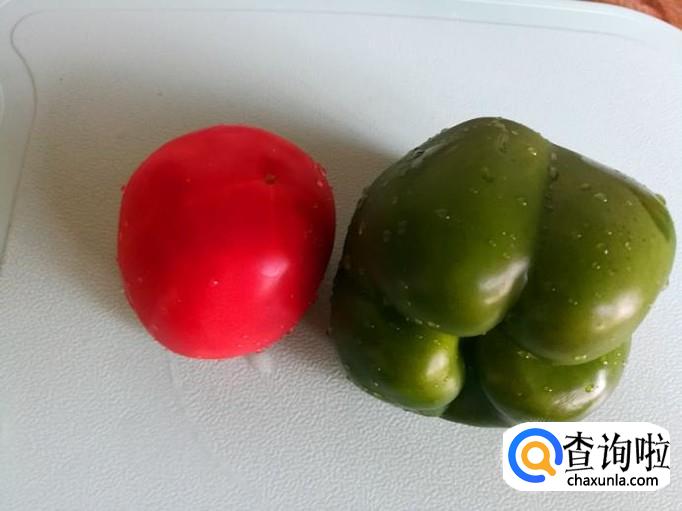 西红柿青椒洗净切成如下的形状备用。