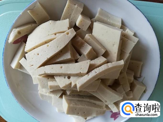 千层豆腐洗净切成如下的形状备用。