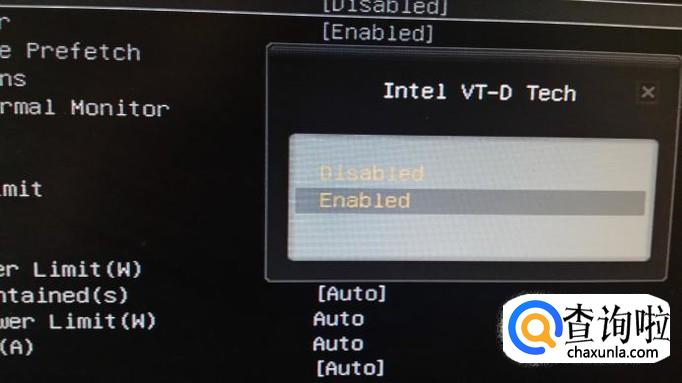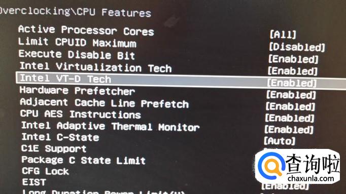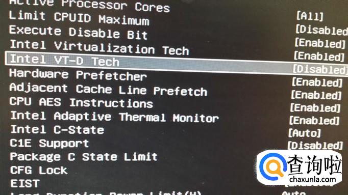 可以看到有一个“Intel VT-D tech”选项,这就是intelCPU虚拟化技术,默认是关闭的。