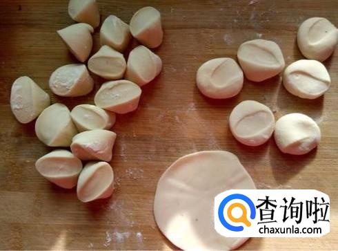 将面团揉成粗细均匀的面条,然后用刀将其切成剂子,在每一个剂子上裹上面粉。