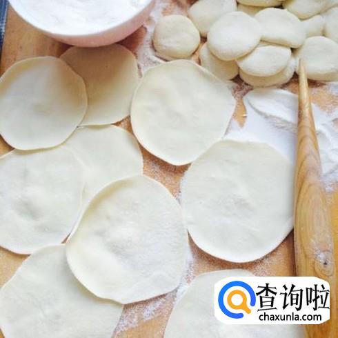 用擀面棍将剂子擀成厚薄均匀的面皮,如下图所示,最好是擀一个面皮包一个饺子,这样可以避免面皮粘在一起。