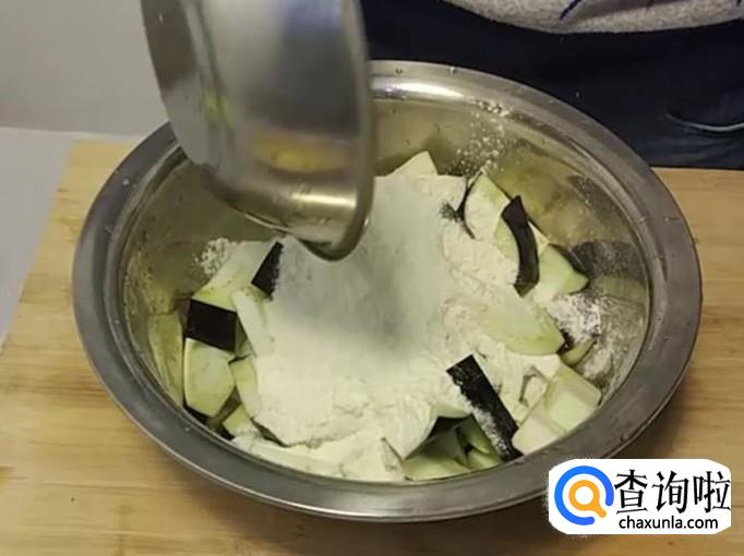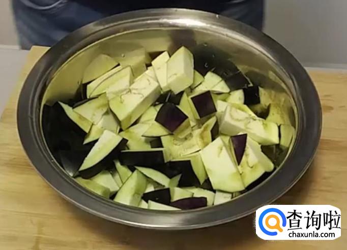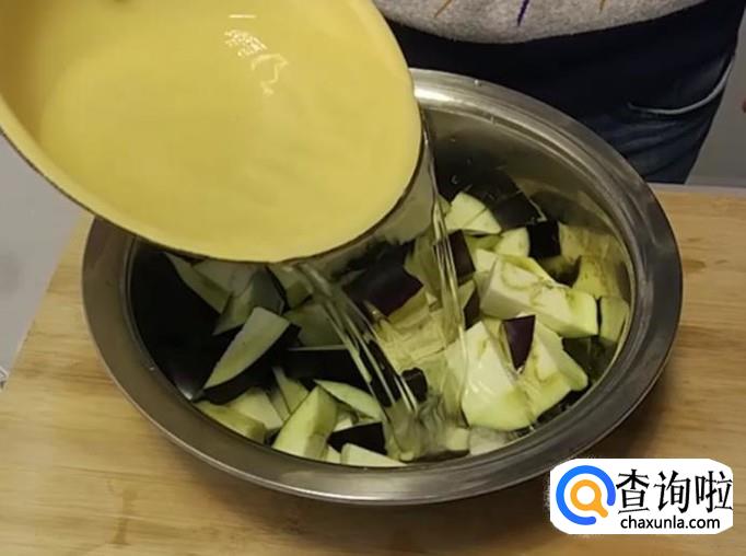 茄子切成块,加水清洗一下,倒掉,加上淀粉搅拌一下备用。