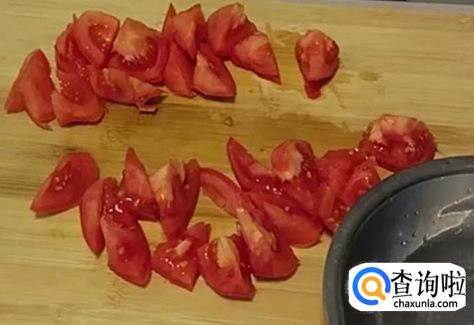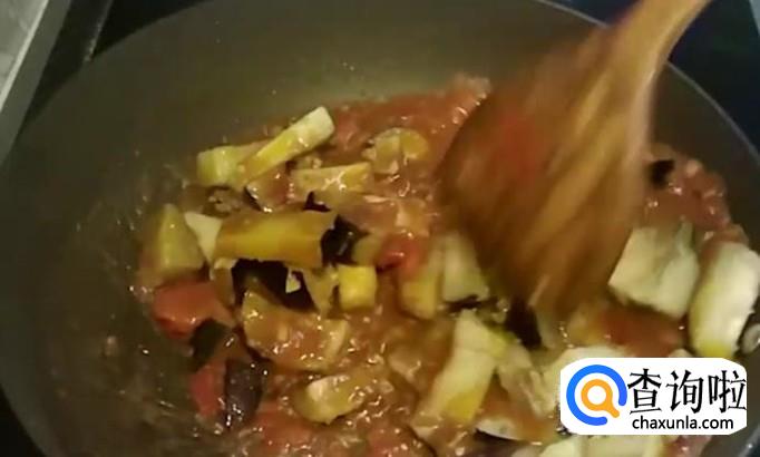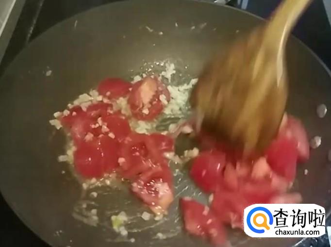 将之前的葱蒜炒香,加入西红柿翻炒均匀,再加入之前的汁和适量的水搅拌均匀。