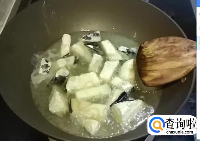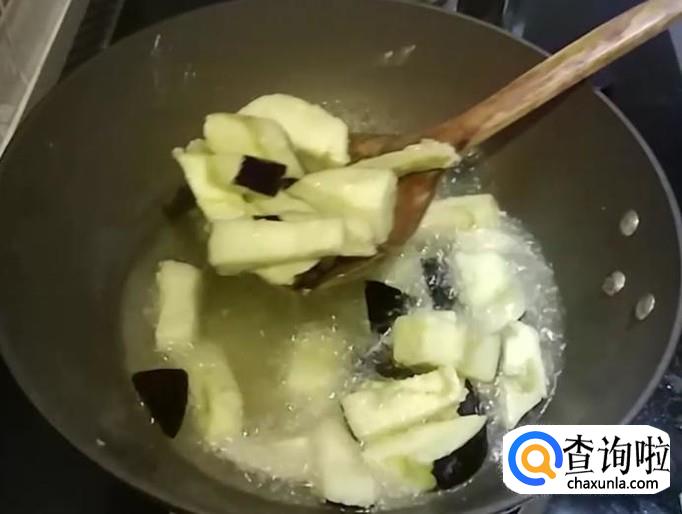 茄子加入热好的油锅中,炸至稍微变黄捞出,备用。