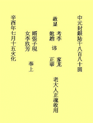 老人死三年内:亡男称新逝显考,亡女称新逝显妣。三年后:亡男称故显考,亡女称故显妣。其三是写姓名和性别,并且姓和名是分开的,如男先人写“某公某某”(前一“某”为姓,“公”为性别,后二“某某”为名),女先人写“某母某氏”(前“某”为夫家之姓,后“某”为外家之姓,因古代女人们多无学名只有小名,而称小名又不够尊重就根据外家之姓称某氏)。其四是在先人的性别之后把男先人称老大人把女先人称老儒人,如果是老的写给小的,则不分性别只在姓名之后写“名下”即可。“收用”这里,有的是“正魂收用”,有的是“冥中收用”包袱第四列:在“孝”字之后写送包人自己与收包人的关系(自称)及姓名,这与第三列一样是比较复杂,不同关系不同辈分的称呼是不同的。包袱第五列:这列的写法比较简单,把具体烧包那天的农历年月日写清楚就行。
