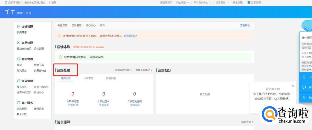 电脑或者手机页面登陆淘宝网 ,点击右上角的【卖家中心】---【体检中心】,可查看对应的违规原因、小二提醒、处置方式、申诉信息等,如图所示。