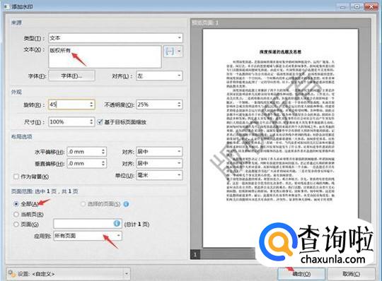 根据自己的要求或习惯,设置水印的内容,外观,页面内容,设置完成后点击“确定”,然后保存文档即可