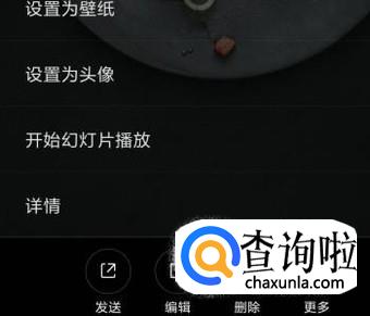 在这相册里,展示着多张照片。手指轻点一下其中一张。这时,在屏幕的底部展开了一行菜单。