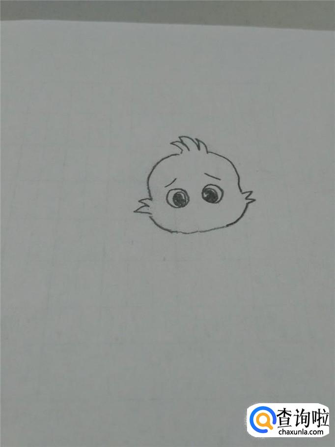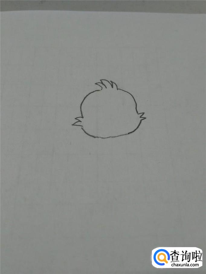 在三缕毛的下面,画一个圆形,表示丑小鸭的头,但是,圆的两边各画两个锯齿形状,表示脸两边的毛。