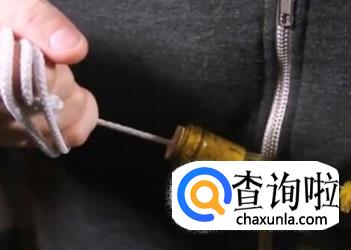 将鞋带绑在钢针上面后,用锤子将钢针钉入到木头塞内部,之后将钢针取出,用力拉住留在外面的鞋带,就能够让软木塞变得松动,进而被拔出来。