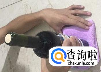 用毛巾将红酒瓶底部包裹住后,一只手握住瓶口,另一只手握住瓶颈,以均匀有力的速度来将对着墙壁撞击底部,瓶塞就会被慢慢顶出来。