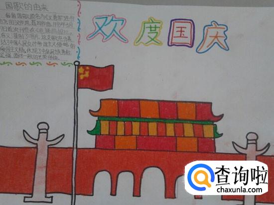 可以将天安门作为国庆的象征,画上天安门和国旗,然后配上国歌的介绍,内容简洁但一目了然。