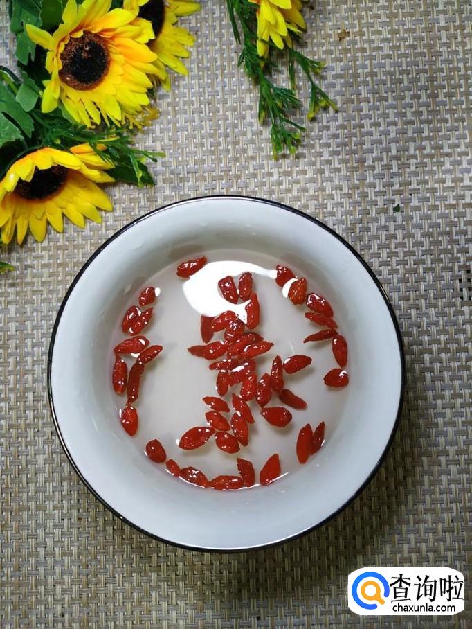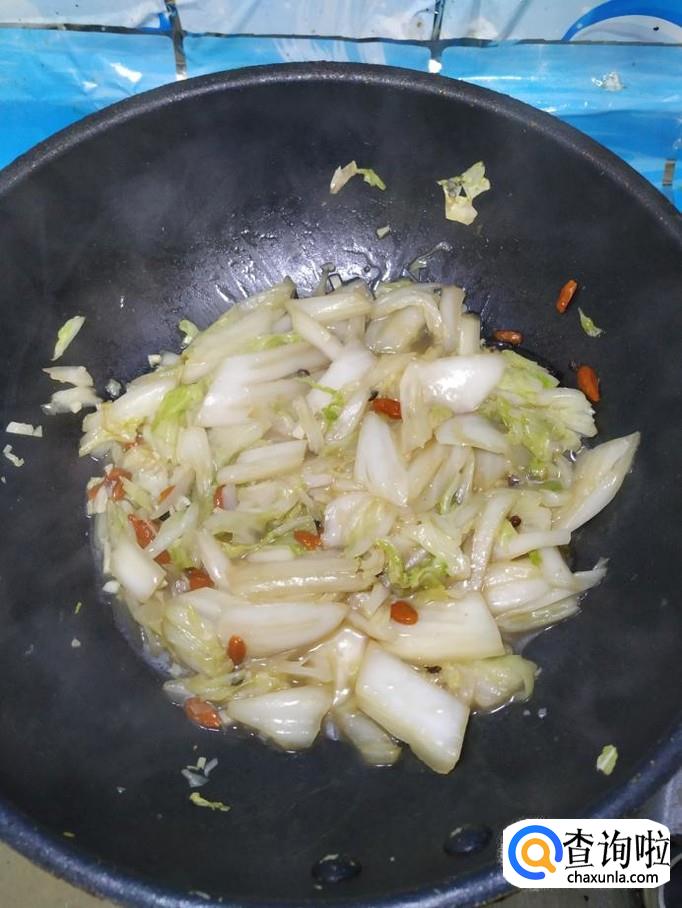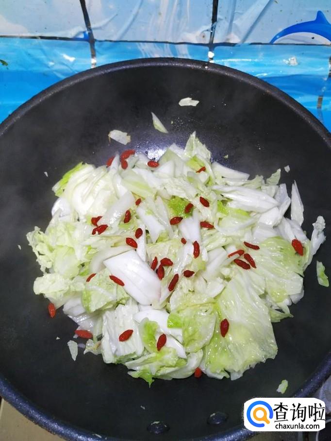 碗中放入适量枸杞子,用清水泡一下,将泡好的枸杞子倒入锅中,和大白菜一起翻炒一下。