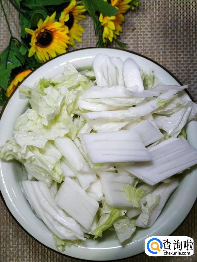 准备适量大白菜,洗净后,切成片,放入盘中备用。