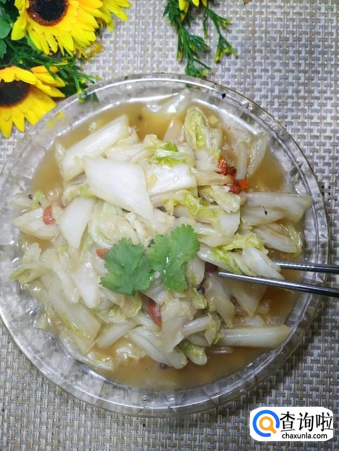 大白菜适量,枸杞子适量,香菜适量,花椒适量,干辣椒适量,盐适量,鸡精适量,生抽适量,白醋适量,淀粉适量。