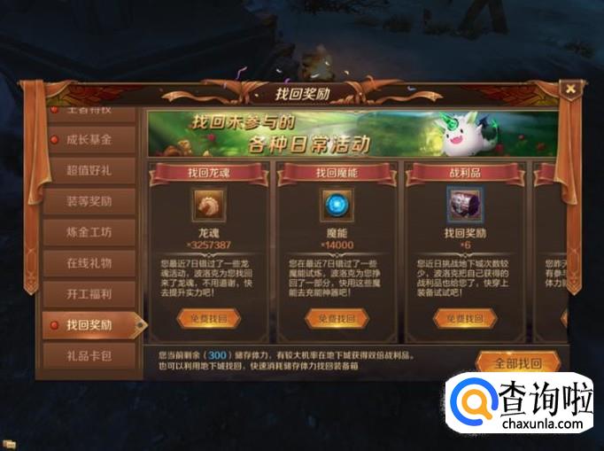 游戏中还有【找回奖励】的功能,通过该功能可以获得大量的离线经验,这也可以让角色得以快速的升级。