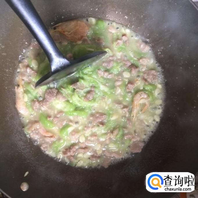接着把事先炒好的瘦肉倒入锅中,翻炒三分钟。