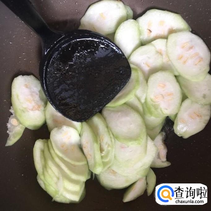接着把丝瓜切成薄片,倒入锅中翻炒两分钟。