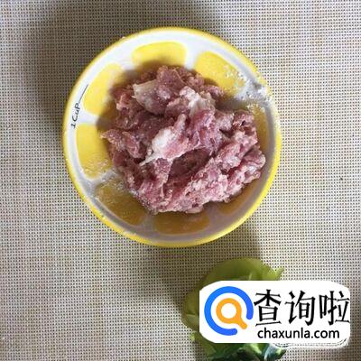 接着把瘦肉切成薄片并用适量的地瓜粉裹一下,如下图所示。