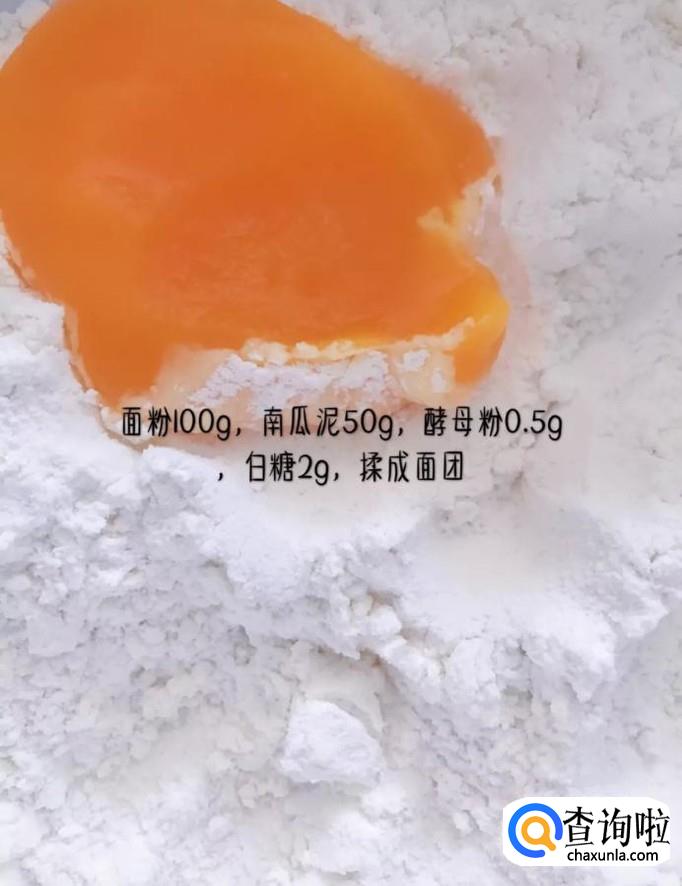 然后在另外一个碗中加入100克的面粉,50克的南瓜泥,0.5克的酵母和两克的白糖揉成面团,如下图所示。