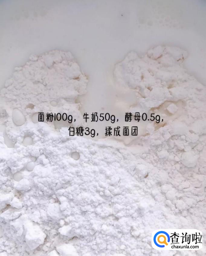 首先,在一个碗内加入100克的面粉、50克的牛奶和0.5克的酵母,搅拌均匀,揉成面团,如下图所示。