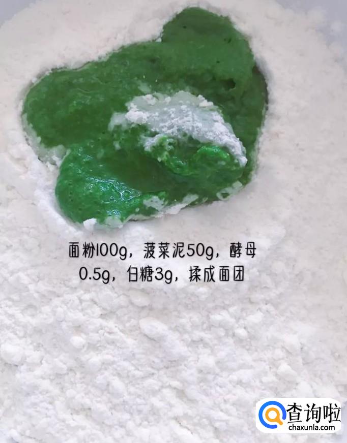 接着在其他的碗中加入100克的面粉,50克的菠菜泥,0.5克的酵母。3克的白糖揉成面团,如下图所示。