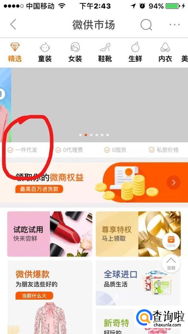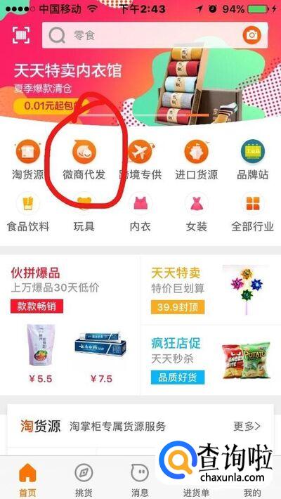 打开1688手机APP的首页,我们在最上面一排小图标中找到“微商代发”字样的图标,这里是专门供应微商一件代发的版块。