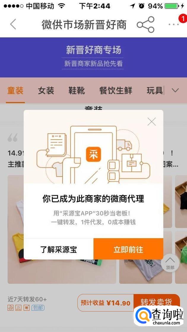 我们挑选好一个想转发销售的商品,然后在这里有“转发卖货”字样的图标,我们点击这个图标进去,会弹出一个窗口,上面写着“你已成为此商家的微商代理”。