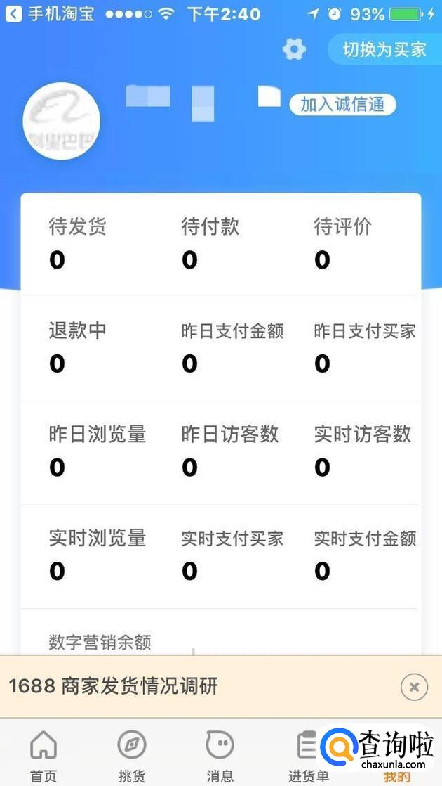 成功登陆1688后,我们可以看到这里有我们的账号个人信息,包括订单等信息,我们如果要做微信一件代发,这个地方可以不用管,如果是自己的店铺一件代发,这里会显示店铺销售信息。
