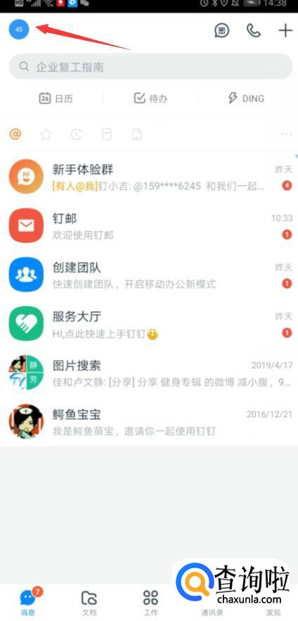 在消息页面,点击左上角的个人头像,进入个人中心。