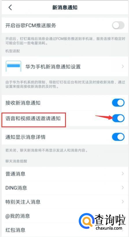 如图我们可以看到语音和视频通话邀请通知是开启的。