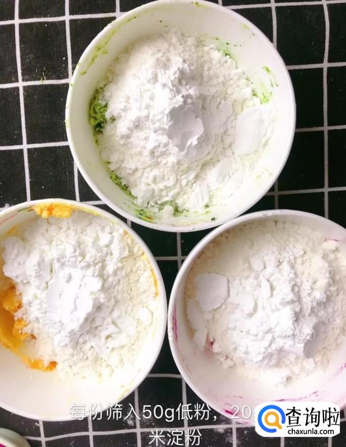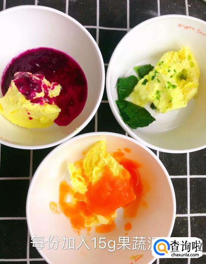 然后平均分成三份,分别加入三种不同的果蔬泥,如下图所示。