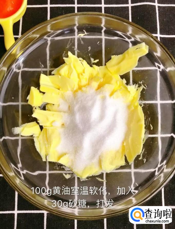 然后将黄油在室温中融化,加入30克的砂糖,用打蛋器打发,如下图所示。