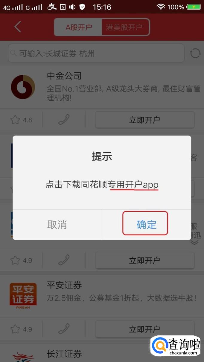 选中券商后,按照提示下载开户专用app,打开app,点击“继续开户”。