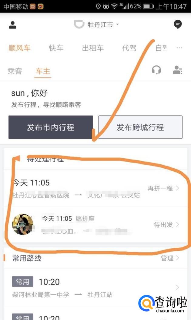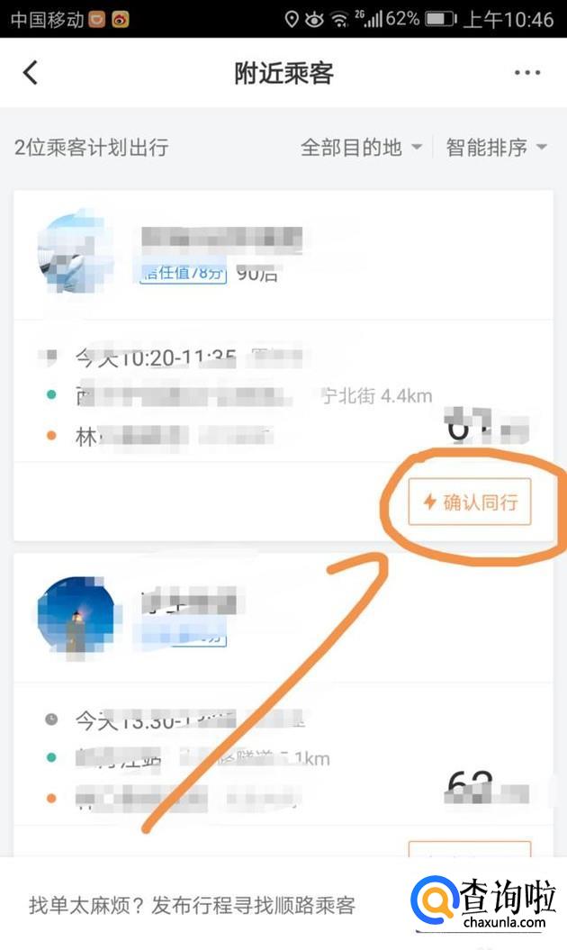 审核通过之后就可以看到提交顺风车需求的乘客了,找到与自己顺路的,点击“确认同行”,在自己出发之前点击这个订单。