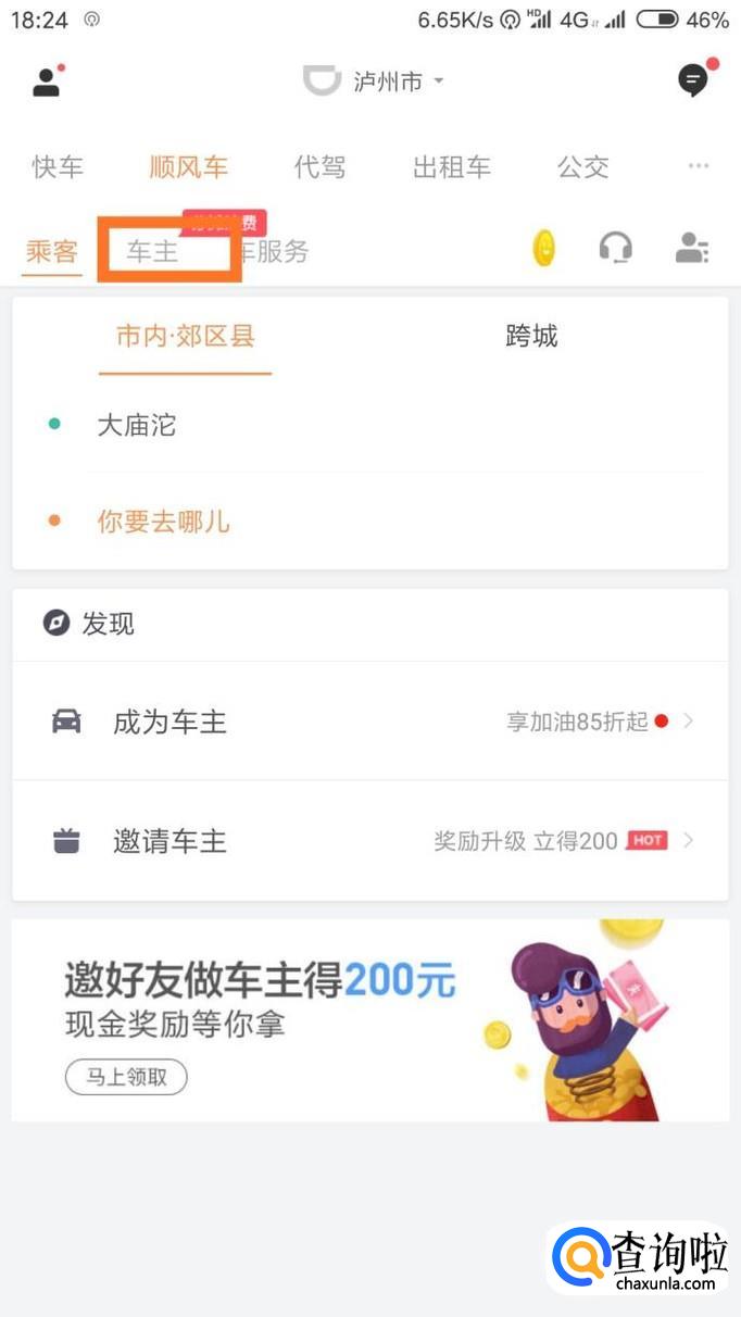 点击“顺风车”,然后点击“车主”,注册一个车主账号,当然需要相关的身份证和行驶证等证件,选择车型和车牌号,提交审核。