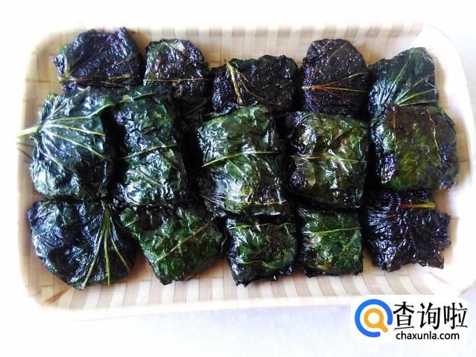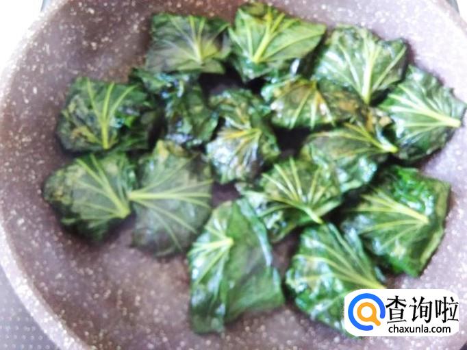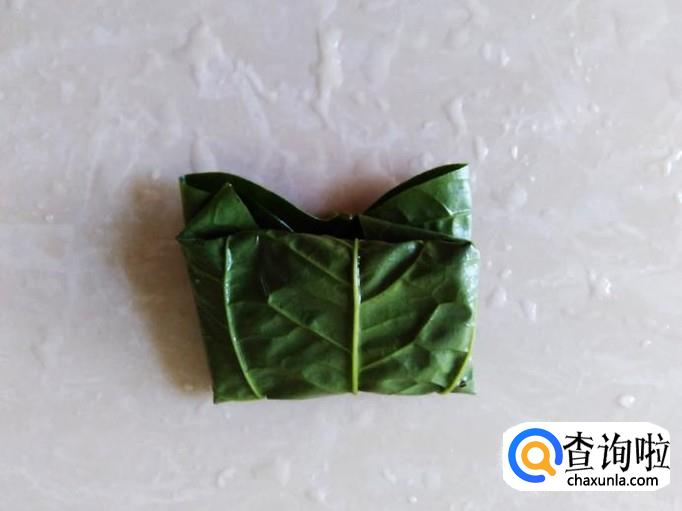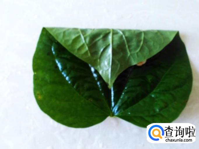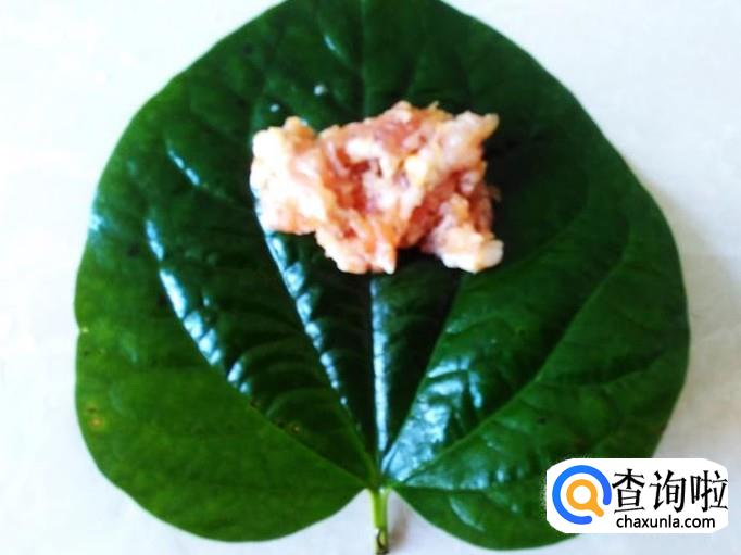 把一片假蒌叶摆好,然后把肉饼放置叶尖下端,把叶尖折盖过来,然后折两边,最后用带梗那边包上去就可以了。