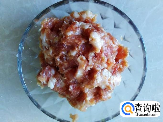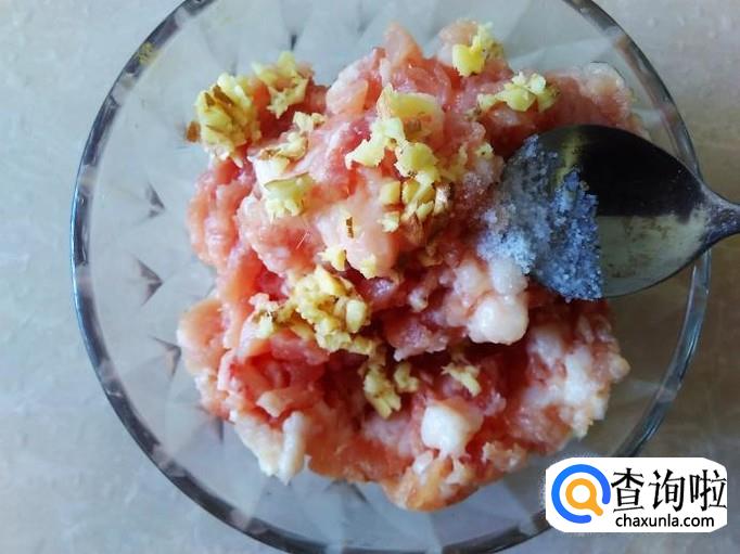 猪肉剁成肉饼,加适量的盐、姜蓉、1勺生抽、1勺料酒腌制几分钟。