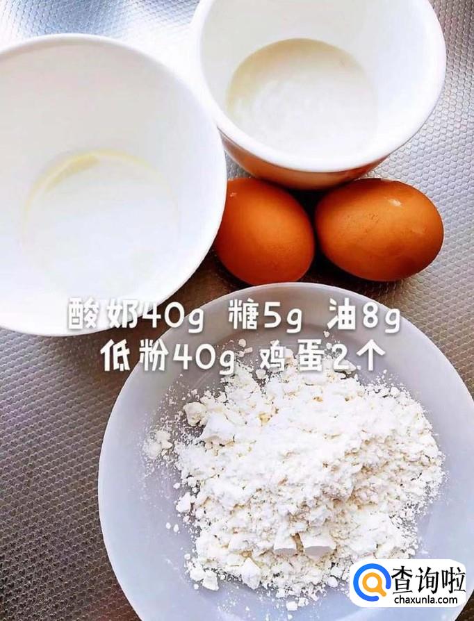 食材:酸奶40克,糖5克,油8克,低粉40克,鸡蛋两个。