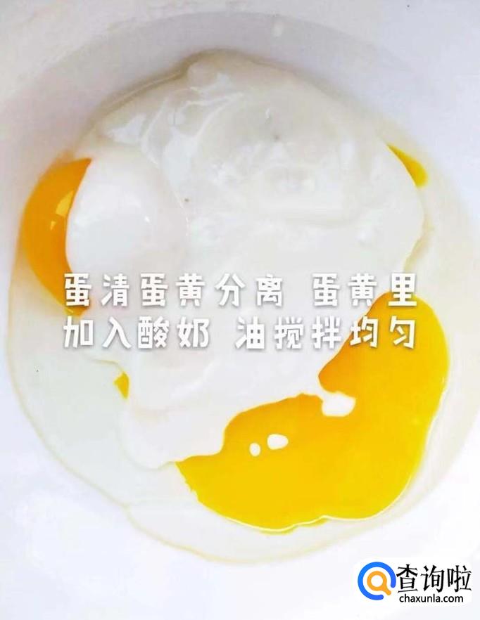 首先将蛋黄蛋清分离,蛋黄里加入酸奶和油,搅拌均匀,如下图所示。