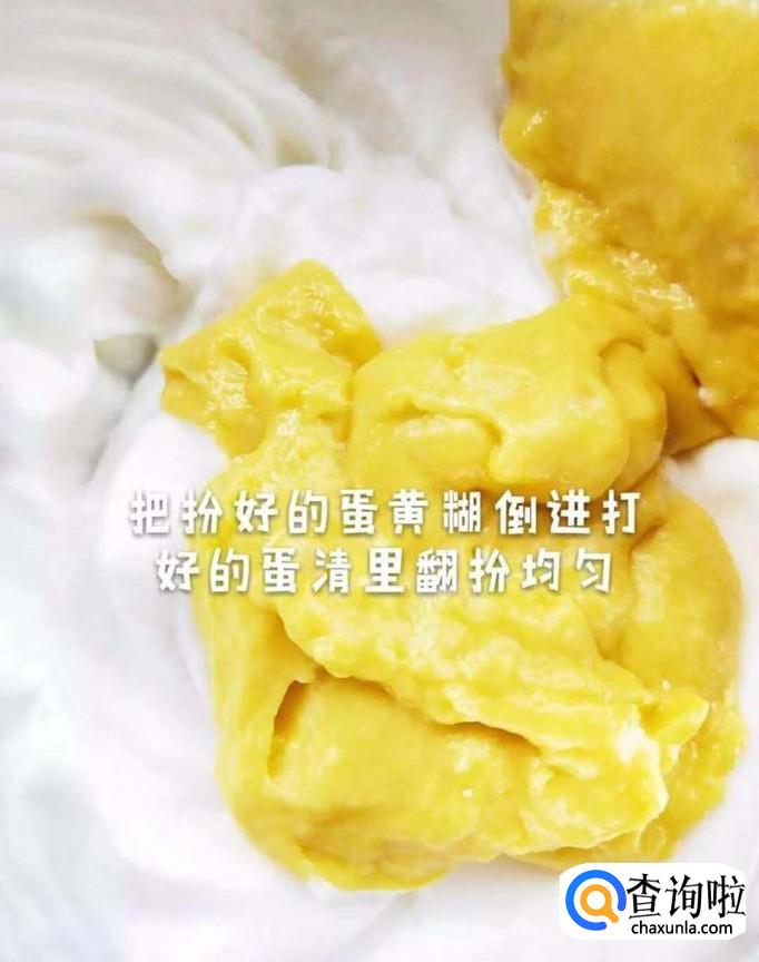 然后把搅拌好的蛋黄糊倒进去和蛋清搅拌均匀,如下图所示。
