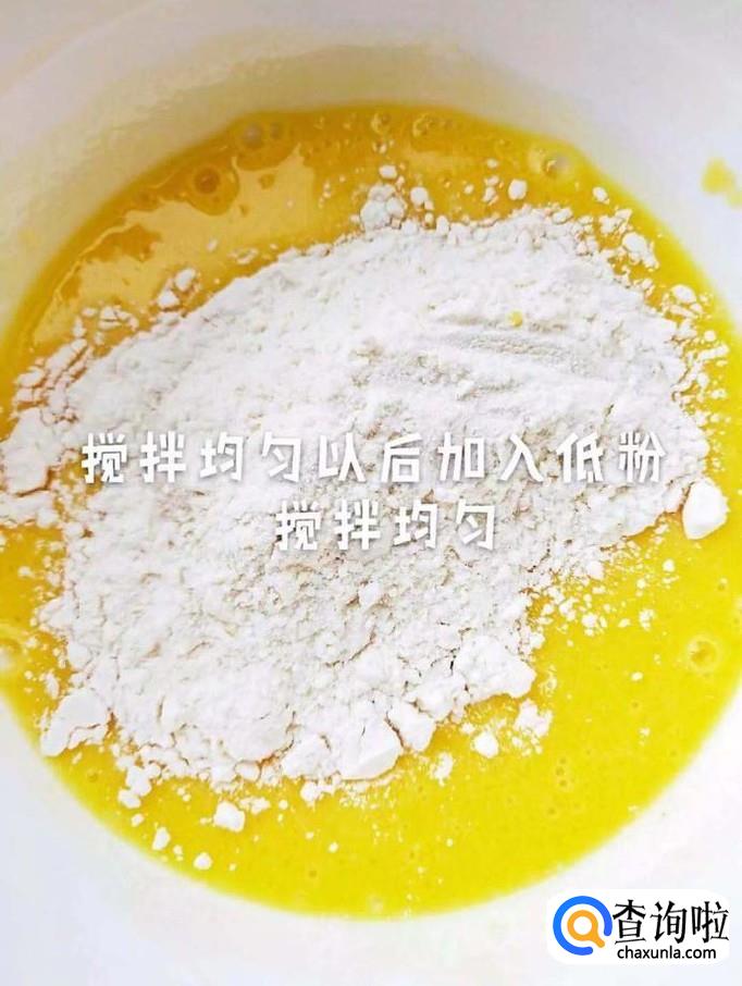 然后加入低粉搅拌均匀,如下图所示。小贴士:低粉最好过一下筛会比较好,这样做出来的松饼会更好。